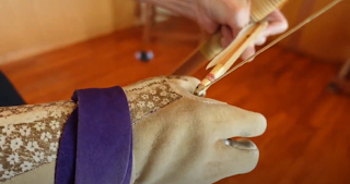 As shown in the picture above, the tip of the bow does not rest on the knee.
